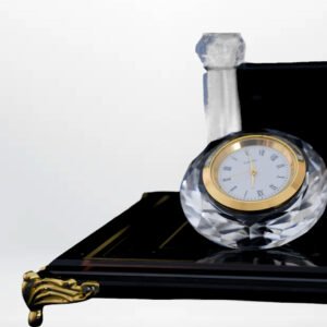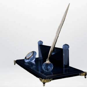 Çalışma masanızın prestijini yükseltecek bu özel set, estetik görünümü ve kullanışlı tasarımıyla hem dekoratif hem de fonksiyonel bir masa aksesuarıdır. Kristal işçiliğe sahip saat ve kalem standı, ışığı her açıdan kırarak zarif bir parıltı oluşturur. Alt kısmındaki klasik detaylara sahip siyah zarif platform, ofis masanıza veya yönetici odasına lüks bir görünüm katar.